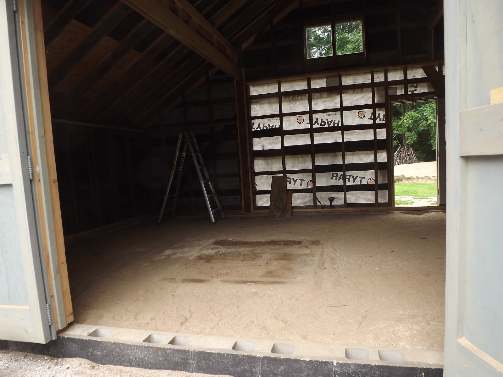 First we moved the bags of screened sand. (We are planning on using it to make mortar for the brick hearth and wall for the wood stove we will be putting in.)